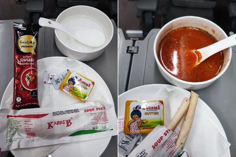 18:30頃、スナックが配られました。トマトスープは粉末ですから、カップに粉末を入れて待っていると、スタッフが巡回しながらお湯を注いでくれます。先程の膨大なお菓子に加えてこのスナックで、もう十分と感じていたら・・・