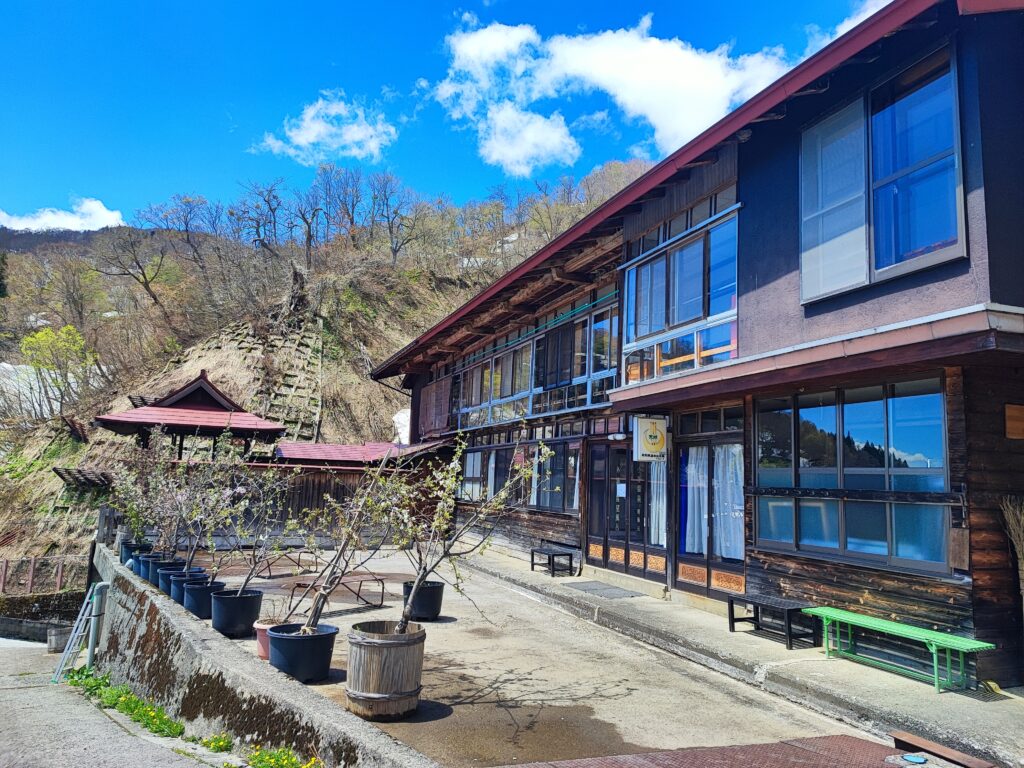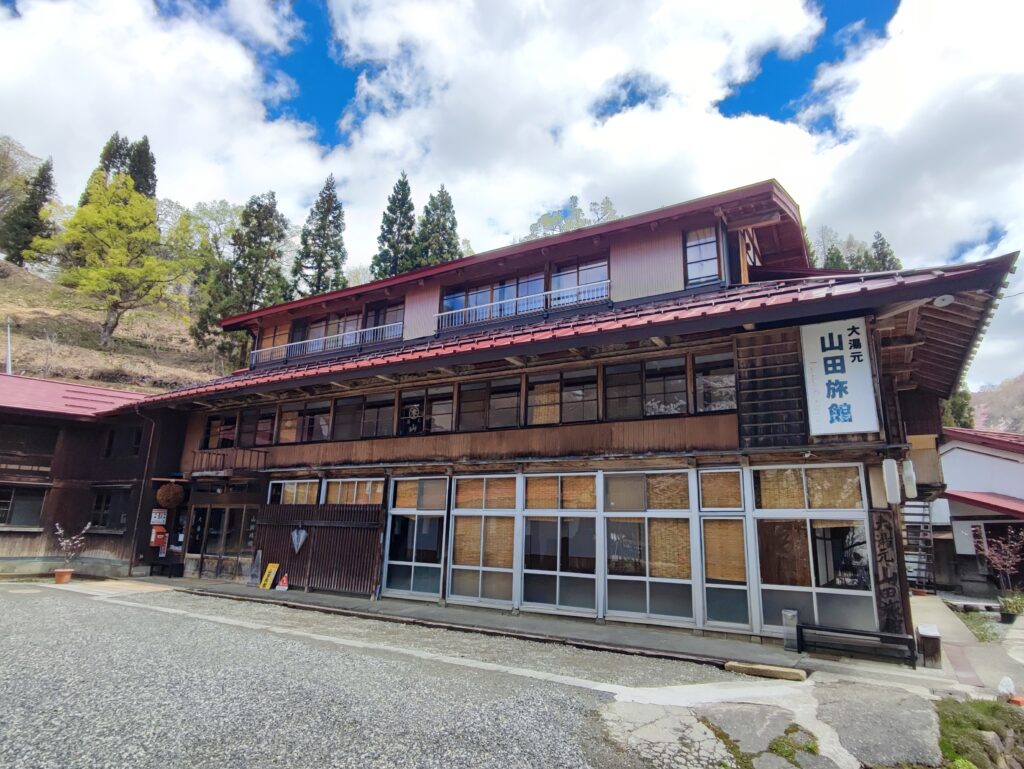 国道148号線から雨飾山の登山口へつながる県道114号線に入り、谷に沿って北東へ坂道をぐんぐん上がってゆくと、やがて小谷温泉へたどり着きます。かつて当地には複数の温泉宿がありましたが、現在は今回訪ねる「山田旅館」の一軒だけ。長年の風雪に耐え忍んできた木造三階建ての趣きある立派な建物からは、老舗ならではの重厚感と、厳しい環境を生き抜いてきた忍耐力が伝わってきます。