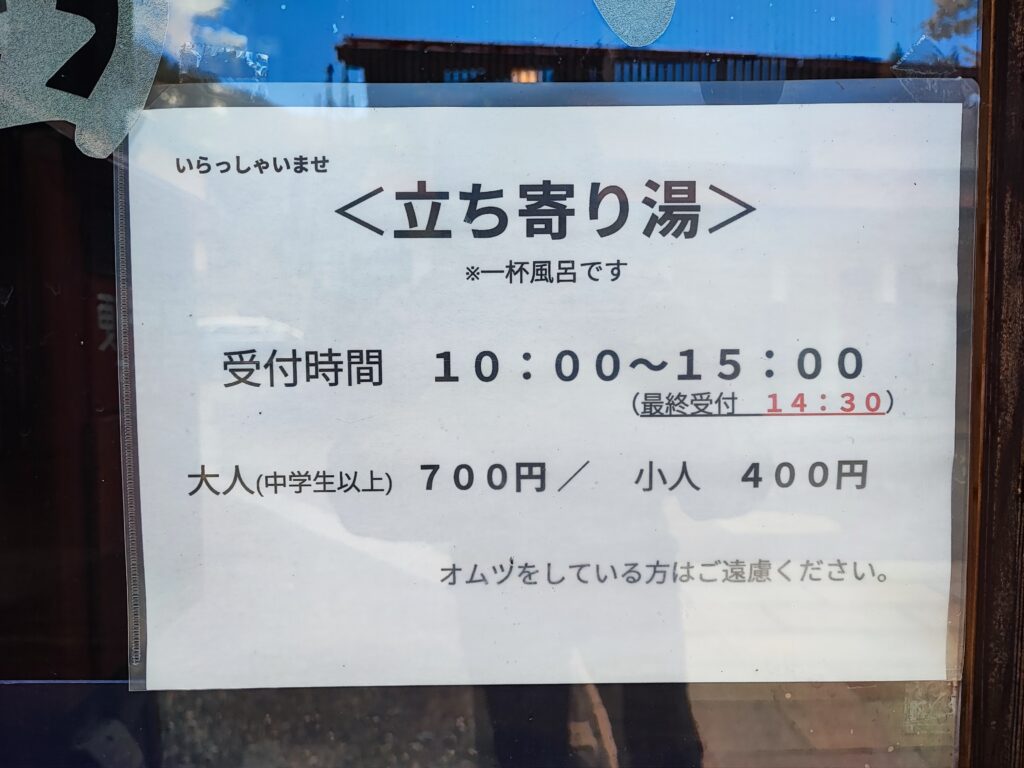 今回は日帰り入浴で利用しました。お宿のお風呂には年中入れる元湯と期間限定の外湯があり、「一杯風呂」と書かれているように、日帰りの場合はいずれか一方を選択することになります。玄関の引き戸を開けた先にある上がり框に日帰り入浴客用の紙が置かれていて、そこへ名前や連絡先を記入し、トレーへ湯銭を納める仕組みです。日帰り入浴の営業時間はちょうど清掃や支度などで忙しいため、このような形態をとっているものと思われますが、私の訪問時はたまたま宿の人がいらっしゃったので、その方へ直接お支払いしました。上述の通り無人状態を前提にした受付のため、日帰り入浴利用の際は予め小銭を用意しましょう。