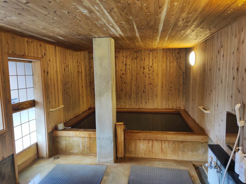 総木造の湯船は5〜6人サイズで、新湯源泉が掛け流されており、実に良い湯加減が維持されていました。