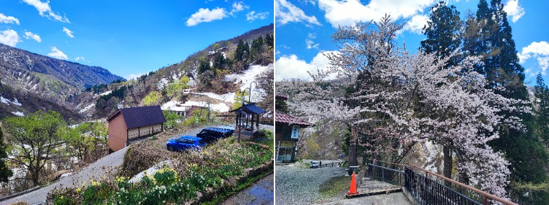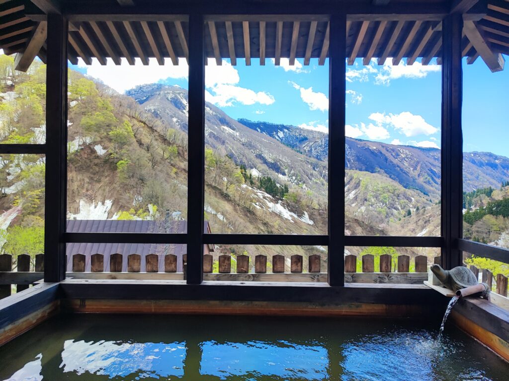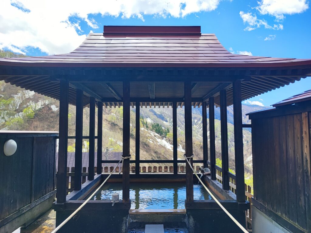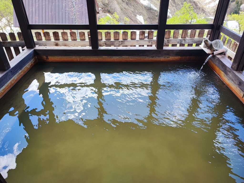 この露天風呂は崖の上に建てられており、眺望が大変素晴らしく、付近の景色を見下ろすのみならず、遠方には白馬連峰が望めました。私が訪ねたのは4月の連休でしたが、春の淡い青空、山の残雪、そして木々の新緑がそれぞれ目に鮮やかで、永遠に眺め続けていたくなるほど美しい景色でした。この日は外気が冷たかったため、湯船のお湯は若干ぬるめだったのですが、寧ろそのお蔭で体に負担なく長湯できたので、飽きるまでひたすらこの絶景を眺め続けたのでした。