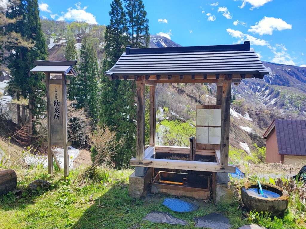 外湯の建物へ向かう途中に飲泉場があり、新湯源泉のお湯を飲むことができます。外湯でも同じ源泉が引かれていますので、味や香りなどのインプレッションは後ほど述べますが、それにしても北国の絶景を眺めながら温泉を飲んだら、体も心もたちまちリフレッシュできちゃいそうですね。