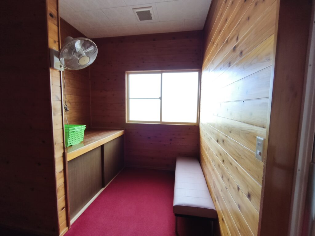 臙脂色のカーペットが敷かれた3号室の室内には長椅子が一脚置かれている他、エアコンやテレビ、ちゃぶ台は無いものの、洗面台、扇風機、ドライヤーなどが備え付けられています。