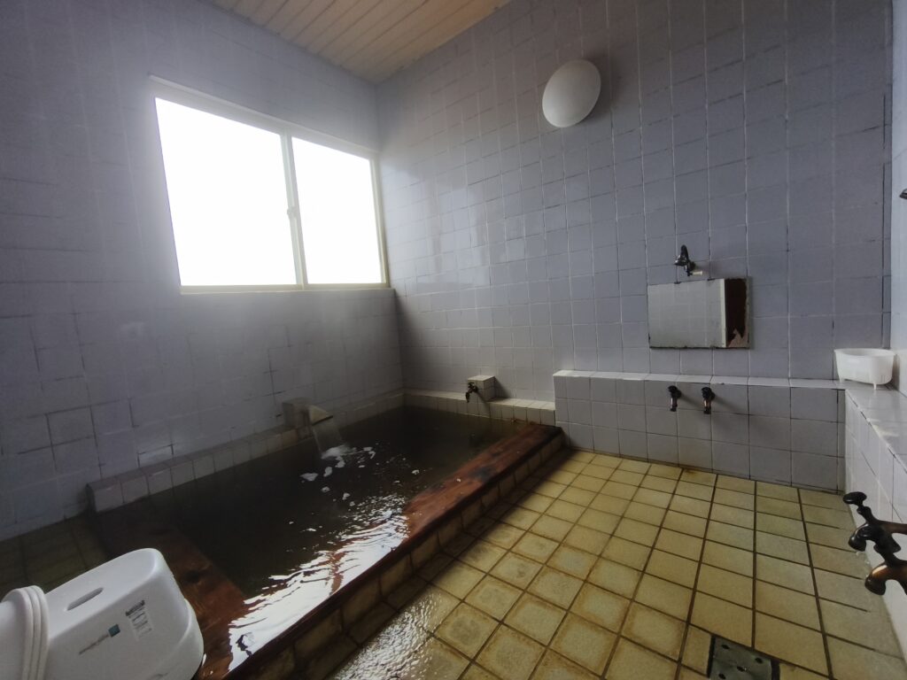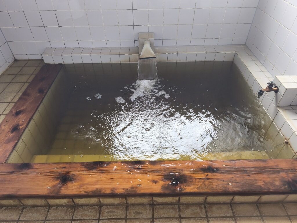 浴槽は2人なら問題なく入れるサイズで、縁は木、槽内はタイル張り。淡い琥珀色を帯びた温泉が大量に投入されており、その溢れ出しで洗い場は常に洪水状態。私が湯船へ入った時には、一気にあふれ出した大量のオーバーフローにより、ドアから脱衣室へ漏れ出さないか心配になったほどです。