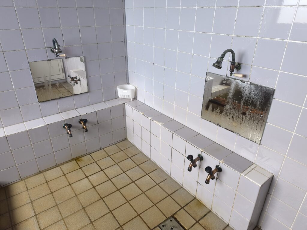 洗い場には押しバネ式カランと壁固定式シャワーの組み合わせが2組あり、お湯のカランからは湯船と同源泉の温泉が吐出されますが・・・