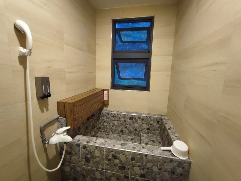 温泉民宿と名乗っている宿ですから、当然施設内で温泉に入れます。こちらのお宿には大浴場が無い代わり、各客室に湯船があり、利用の都度バルブを開けて温泉のお湯を張って入浴することになります。なおシャワーから出るお湯も温泉です。