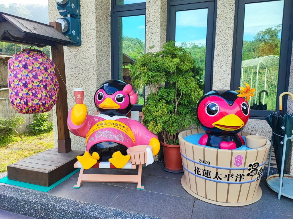 ちなみに花蓮県では県内の有名温泉地である瑞穂温泉と安通温泉でここ数年「花蓮太平洋温泉フェスティバル」と称するキャンペーンが実施されており、瑞穂温泉を「英雄泉」、安通温泉を「美人泉」と位置付けて、観光振興のイベントが催されているんだとか。おそらくこの2羽の鳥と思しきキャラは安通温泉の美人湯に浸かる女の子なんでしょうね。