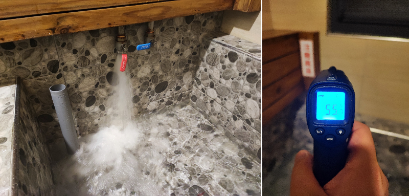 温泉のバルブを全開にすると、ほんのりタマゴ臭を放つ55℃の温泉がドバドバと大量吐出されました。一人で入るにはちょっと大きめの湯船なのですが、投入量が多いのですぐに入浴に適する湯嵩に達します。ただ、さすがに55℃のお湯へそのまま入るわけにはいかないので、同時に加水しながら湯加減を調整する必要があります。