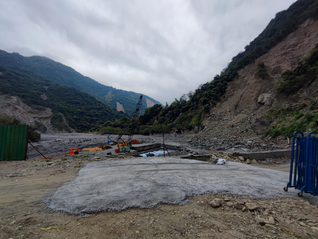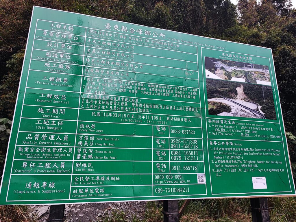 工事現場の目の前には東64線道路復旧工事の概要に関する看板が立っています。これによると、施工期間は2026年11月8日となっていますが、整地もままならず、橋脚が1本も立てられていない状況で、2026年11月までに工事が終わるとは思えません。このあたりの適当な感覚はいかにも台湾らしいところです。