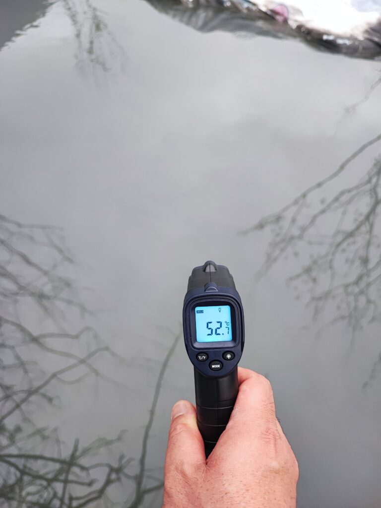 88℃の熱湯を少しだけ引いてお湯を張っているのですが、そもそも高温なのでなかなか冷めず、湯溜まりでは52.7℃でした。これでも入浴するには熱いですね。