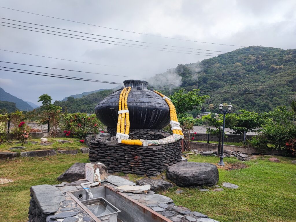 庭に設置された壺のような大きなモニュメントの上からは、温泉の白い湯気が濛々とあがっています。また画像の手前側にちょっと見切れていますが、温泉卵をつくるための専用槽も設けられています。こちらの宿では源泉を所有し、且つその湯量も豊富なようです。