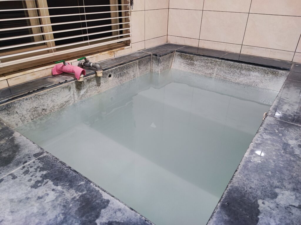 浴槽に張ったお湯は弱く白濁しています。そういえば浴槽自体も全体的にクリーム色っぽい析出が付着していましたが、これって温泉由来の着色なのでしょうね。白濁と言っても硫黄泉ではなく、カルシウムによる懸濁かと思われます。