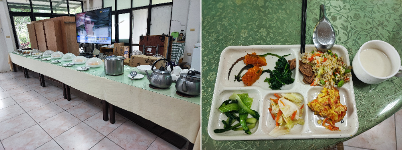 宿泊料金にはバッフェスタイルの朝食が含まれており、食堂で7:00~9:00の間にいただけます。食券など不要。手ぶらで食堂へ行けば大丈夫。並べられている料理は台湾の素食っぽいものがメインで、そこにスクランブルエッグやゆで卵といった動物性たんぱく質が加わります。