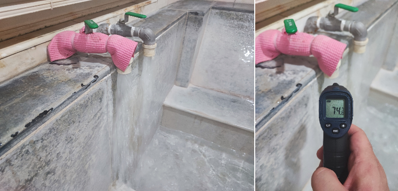 さぁ、浴槽にお湯を張るぞ。コックを開けて出てくる温泉は75℃近い激熱ですから、加水は必須なのですが、それゆえ湯船にお湯が溜まるのも早く、10~15分で十分な湯嵩に達します。