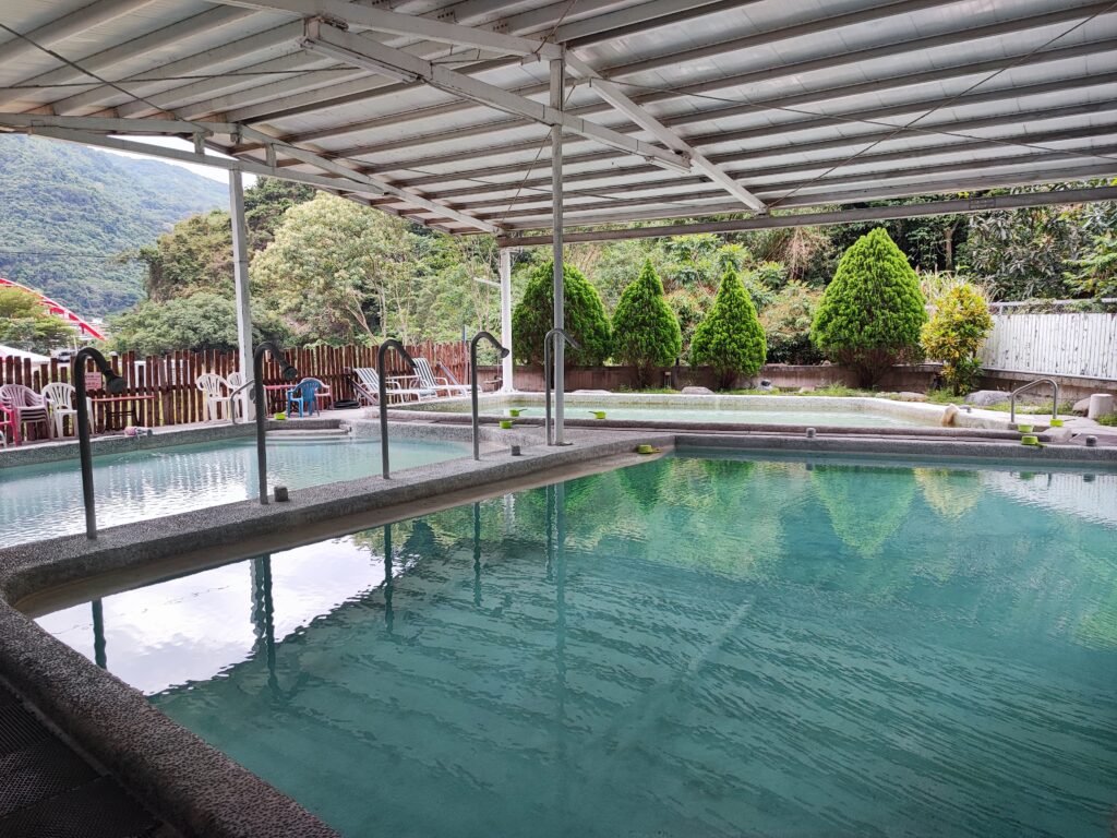 台東県金崙温泉の各温泉旅館には大抵露天の温泉プールがあり、日帰り入浴を受け付けていますが、こちらのお宿でも同じく露天温泉プールを利用できますので、宿泊滞在中の晩と朝に入ってみました。