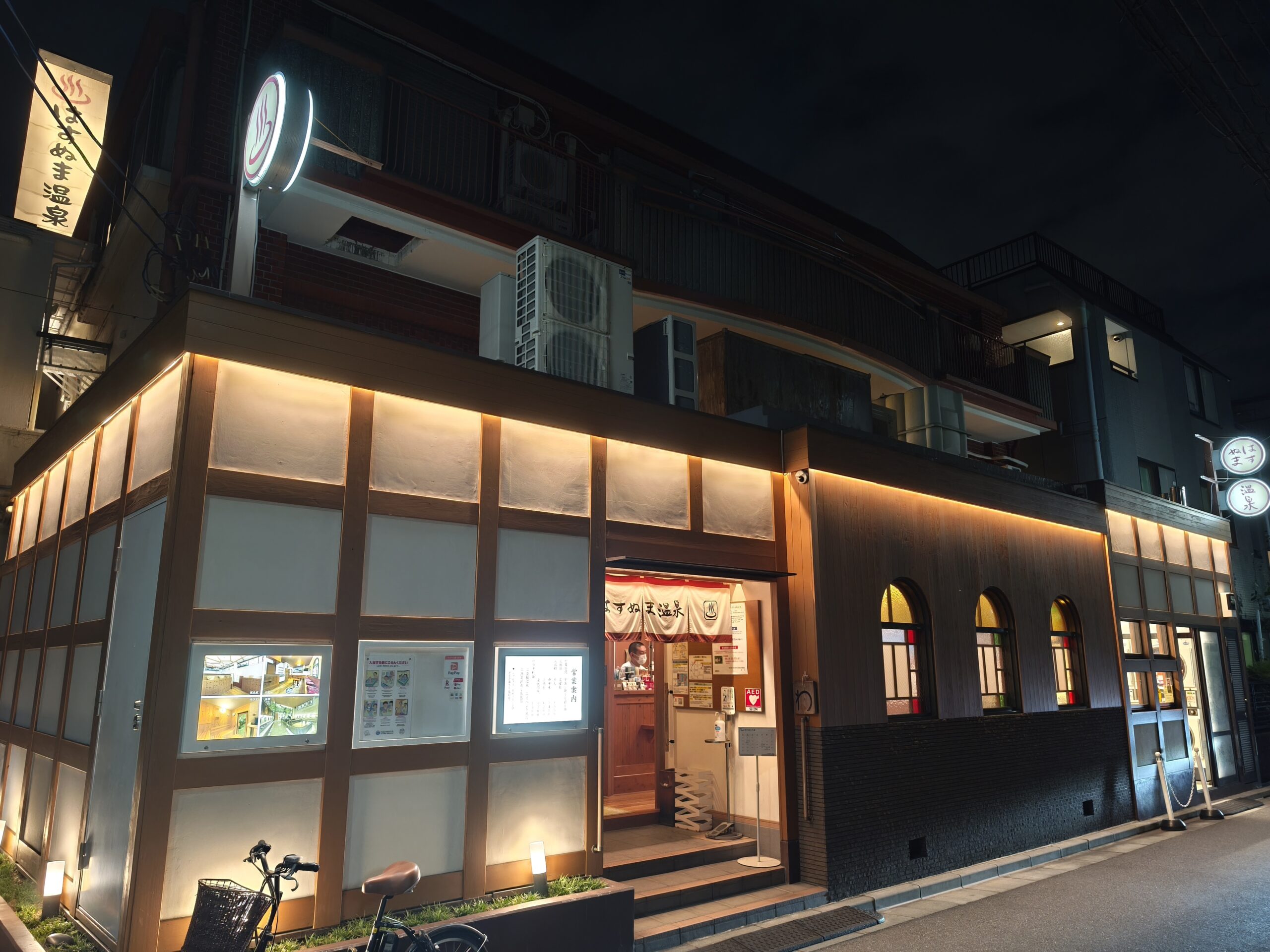 灯台下暗しという言葉の通り、私は都内で毎日生活しているくせに、都内の温泉施設には非常に疎く、それゆえ拙ブログでもこれまであまり取り上げておりません。そんな私が2025年6月の某日、諸般の都合によりほぼ徹夜の状況で日付を跨ぐこととなり、せっかくなら鉱泉の銭湯で汗を流そうと考えて向かったのが、東急池上線蓮沼駅の至近にある銭湯「はすぬま温泉」です。昭和19年創業という古い銭湯ですが、2017年にリニューアルされており、ファサードはもちろん、館内も綺麗に改装されています。またカウンター形の番台で湯銭を支払う際は、現金のほか各種キャッシュレス決済も対応しており、当世風の便利さも兼ね備えています。