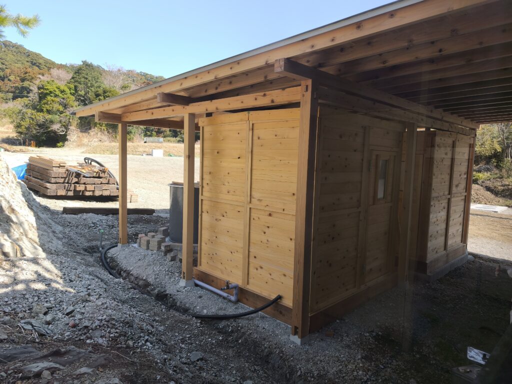 お風呂上がりに廊下を歩いていたら、建物の裏手で何やら工事中。この木造小屋はおそらくサウナになるのかな。この他露天風呂やキャンプ場も造るんだとか。完成が楽しみですね。