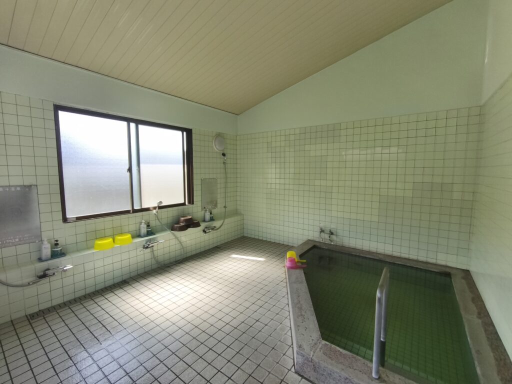 男女別の浴室はタイル張りで、浴槽が一つ、シャワー付きカランが3つ、それぞれ設けられています。全体的に淡いグリーンの色調で統一されていますね。