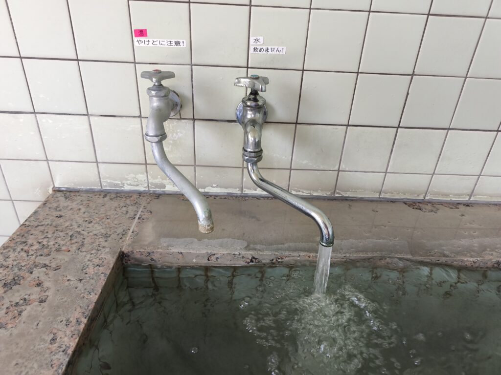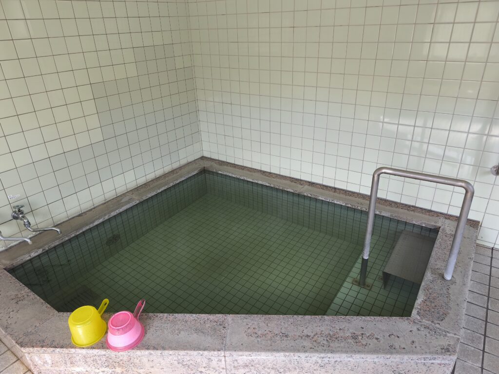 浴槽はホームベースみたいな形状をしており、おそらく3~4人サイズかと思われます。浴槽内側面に循環装置の吸込口らしきものを確認できますが、訪問時には稼働していませんでした。館内に掲示されている平成30年の分析表には、お湯を循環させている旨が記載されているように、以前はお湯を循環させていたのかもしれませんが、現在は循環させず、後述する蛇口から出すお湯を溜めておくスタイル(溜め湯式)を採っているようです。