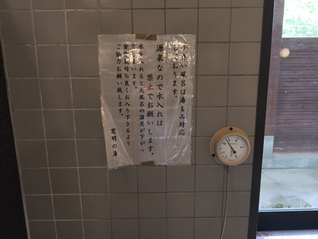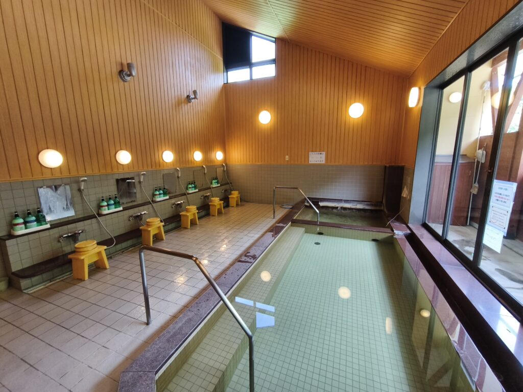 以前の施設では露天風呂をはじめとして様々な種類の浴槽が設けられていましたが、現施設では内湯のみで浴槽も大小のタイル張りがそれぞれ1つずつと、かなりダウンサイジングされました。なお内湯から屋外に出られるようなドアはあるものの、私の訪問時は施錠されていたため開けられませんでした。施設名の窓明(マドアケ)とはこの近隣に聳える山の名前ですが、そんな名前とは裏腹に浴室の窓はあけられないんですね。なお洗い場にはシャワー付き水栓が5個並んでおり、ボディーソープやシャンプー類もちゃんと備え付けられています。