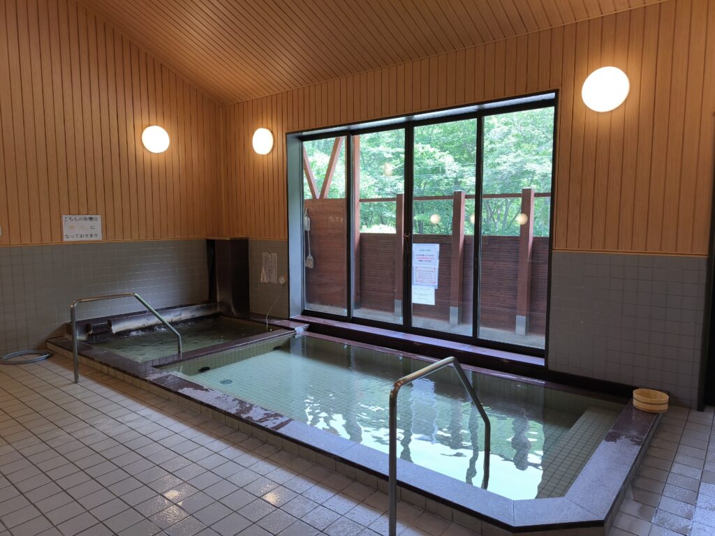 さてこちらのお湯は無色透明でほぼ無味無臭の単純泉です。分析表によれば炭酸イオンが15.0mgも含まれているにもかかわらず、滑らかなツルスベ浴感があまり得られず、その他の特徴的な浴感もあまり無いので、いまひとつ掴みどころに欠けるのですが、むしろこうしたお湯の方が万人受けして使い勝手も良いので、多くの利用者から愛され続けるのかもしれません。私もちょっと熱いお湯に浸かることで、身も心もシャキッと引き締まり、気持ち良く登山の汗を流すことができました。