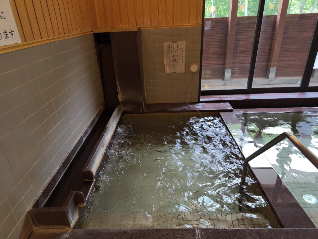 一方、小さな浴槽には湧出温度60度以上の源泉が加水されず激熱の状態でそのまま注がれており、湯船も普通の人だったら入れないような異様な熱さとなっていました。私の体感で46℃はあったのではないでしょうか。私以外のお客さんはこの小浴槽に足を入れるや否や悲鳴を上げて退散していました。私も入ってみましたが、浴槽内では泡風呂装置が稼働しており、この水流が熱さを余計煽ってしまうため、全身が忽ち真っ赤になり、10秒も浸かっていられませんでした。